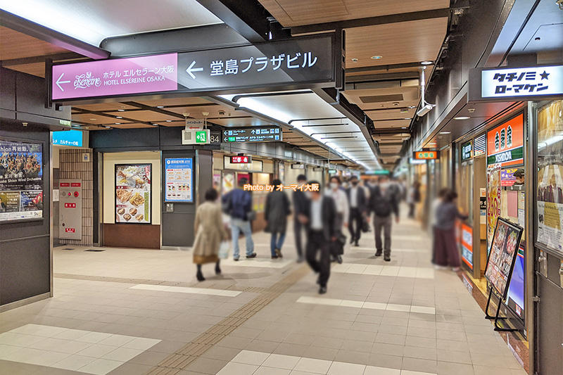 地下街の「ドーチカ」へ入れば、目的地の「ホテルエルセラーン大阪」まであと少し。150メートルくらい直進すると、頭上に「ホテルエルセラーン大阪」の案内が見えてきます。天気が良ければ、地上からアクセスするほうがわかりやすく、短時間で「ホテルエルセラーン大阪」へ到着できるのですが、天気が悪い日、特に、強い雨が降る日は、地下からアクセスするほうが荷物が濡れず便利です。