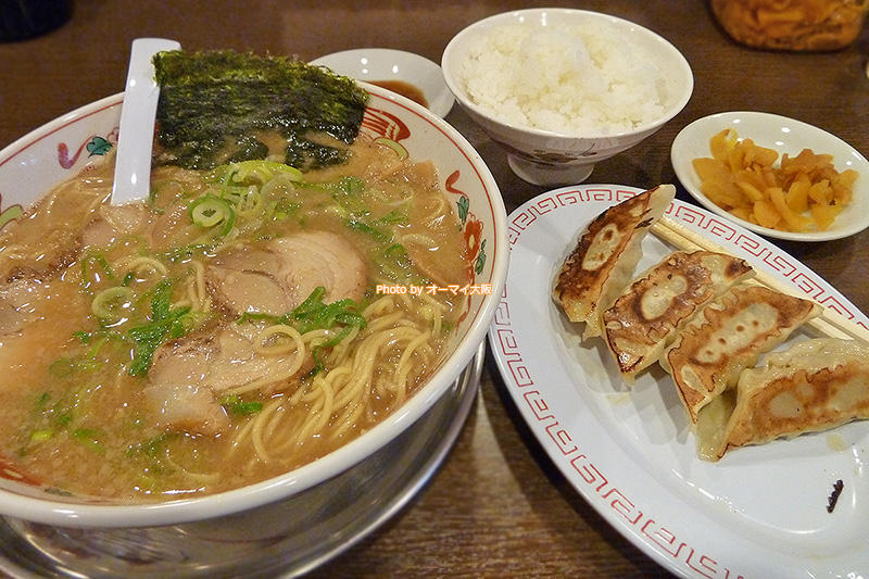 今回のランチで注文したメニューは、こってり味の中華麺「熟成」。6個入りの餃子(写真を撮影する前に2個しれっと食べてしまいました)とライスも注文しました。ランチタイムは、ライス(小)の無料サービスがあります。
