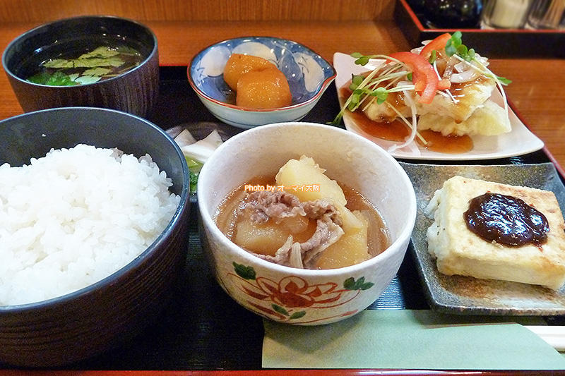 この日の日替わり定食のおかずは、豆腐田楽と肉じゃが。どちらのおかずもめっちゃおいしいです!