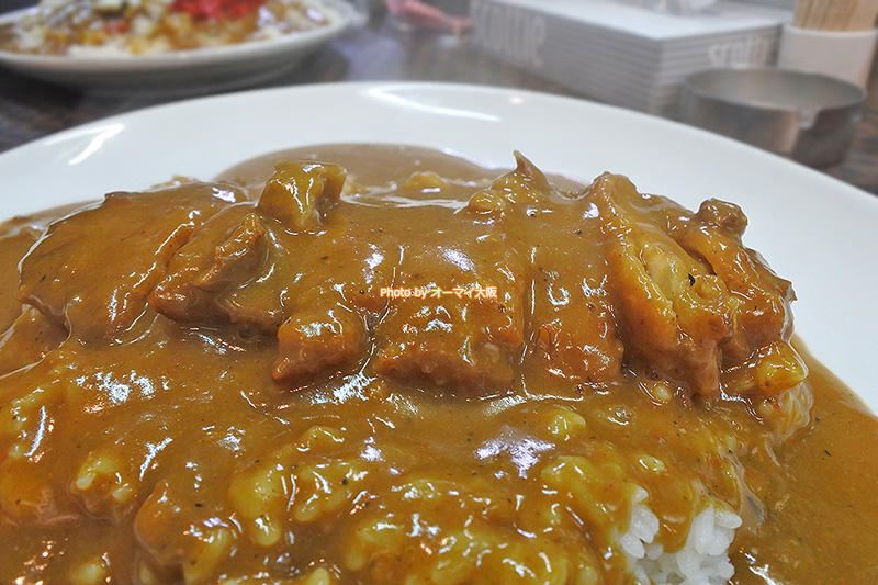 今回のランチで注文したメニューは「カレーの小盛りとトッピングのトンカツ」。前回のランチで「カレーの中盛り」を食べて、おなかいっぱいになったので、今回は「カレーは小盛りにして、トッピングを何か注文してみよう」と決めていました。スタッフさんに質問したら「人気はカツです」と教えてくれたので、迷わずトライ!
