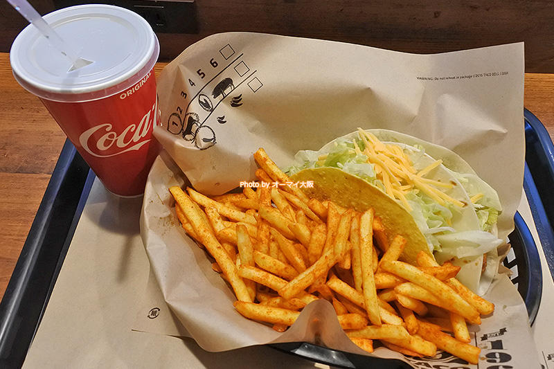 そんなわけで、久しぶりに「タコベル」のタコスを食べます。記念すべき「タコベル 道頓堀店」の初ランチで注文したメニューは「タコス2個とポテトとドリンクのセット」。タコスは、ビーフ、ポーク、チキンから選ぶことができます。