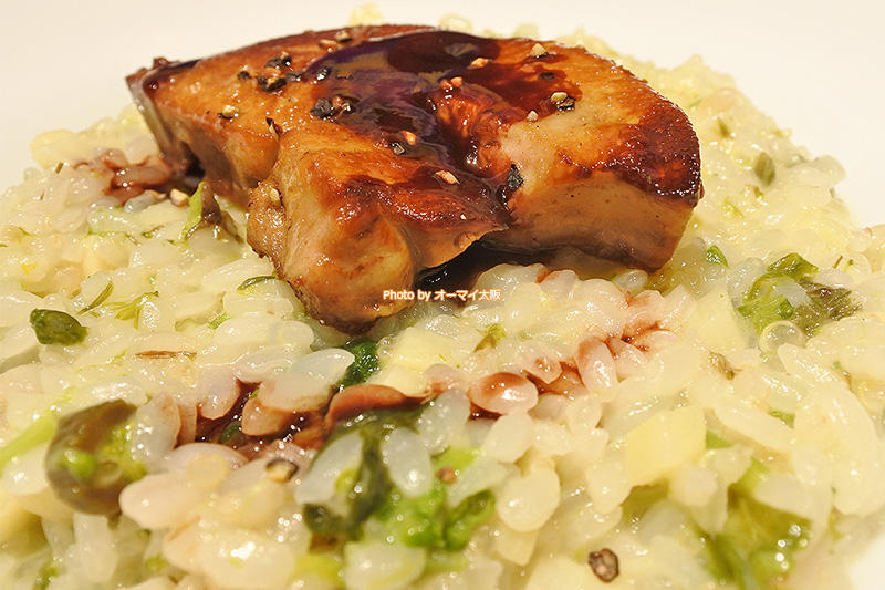 今回の試食レビューは「フォアグラをのせた春野菜のリゾット」です。フォアグラを食べる機会なんて、年に数えるほどしかないので、テンションが上がります。相変わらず「俺のフレンチ 梅田」の料理は、ビジュアルが美しいです。