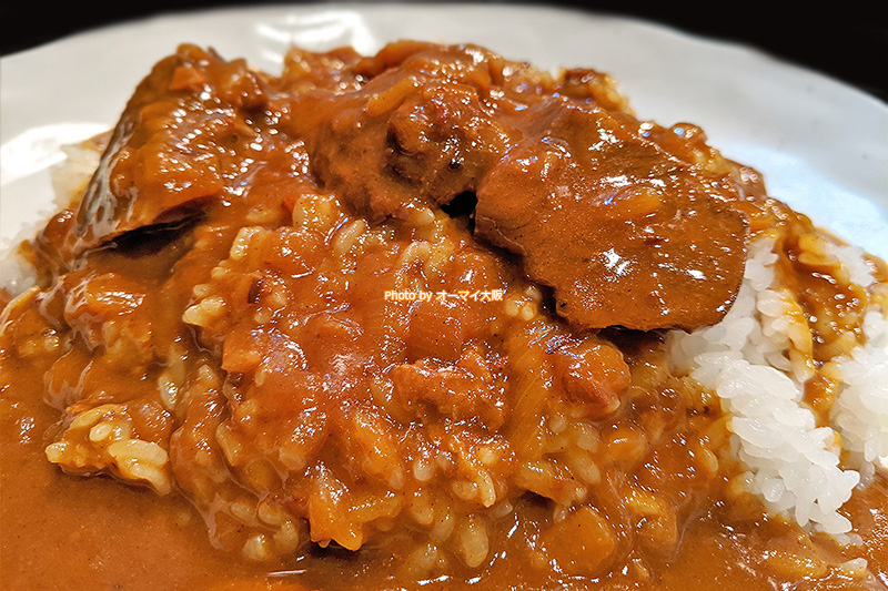 正統派の欧風カレーらしく、トッピングは国産牛肉の大きな塊が3個だけ。ベースの牛肉や野菜はルーに溶け込んでいて「これぞ王道のカレー!ビジュアルはシンプルだけど、存在感のあるカレーだなあ」と伝わってくるところが最高です!