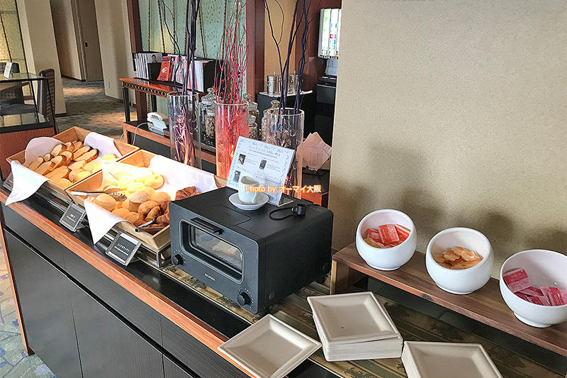 さらに、7時から9時は、パンやヨーグルトなどの無料の朝食サービスがあります。専用ラウンジで食べられるパンは「リーガロイヤルホテル大阪」で作られているパンで、めっちゃおいしいです。さりげなく「バルミューダ」のトースターを置いているところもステキな演出ではないでしょうか?