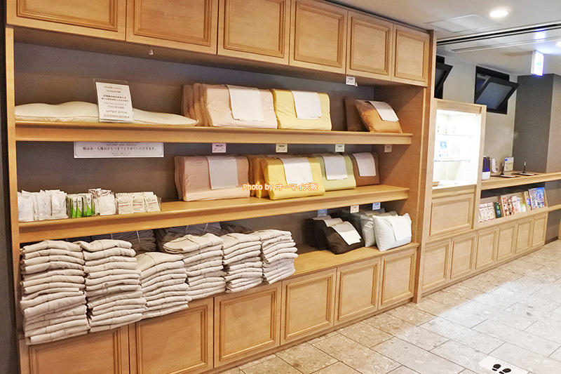 ドリンク(粉末の緑茶)、入浴剤、カミソリ、ヘアブラシなどの客室アメニティは、ホテルの2階にあるアメニティコーナーで自由に選ぶことができます。さらに、枕やパジャマも2階にあるアメニティコーナーで選ぶシステムになっています。テイクアウトできるコーヒーやミネラルウォーターも2階に用意されています。